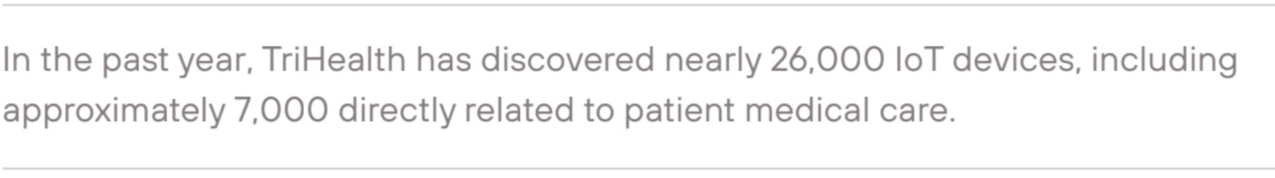 Currently, TriHealth uses more than 175,000 connected devices. While Internet of Medical Things (IoMT) devices are critical for patient care, they have weak in-built security, and many are inherently vulnerable or become vulnerable over a long operational lifespan. This makes them popular targets for cyberattacks. TriHealth needed a solution to protect patients, ensure security, and mitigate any risks from vulnerable IoT devices.